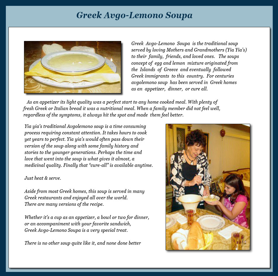Greek Avgo-Lemono Soupa is the traditional soup served by loving Mothers and Grandmothers (Yia Yia’s) to their family, friends, and loved ones. The soups concept of egg and lemon mixture originated from the Islands of Greece and eventually followed Greek immigrants to this country.